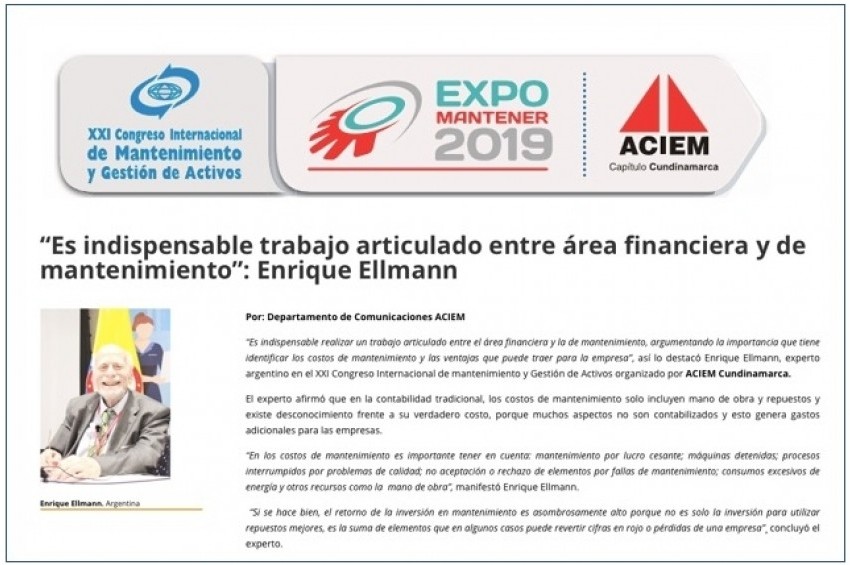 Ellmann y Asociados ha participado en el 03/05/2019 - XXI Congreso Internacional de Mantenimiento y Gestión de Activos 2019 - Colombia, organizado por ACIEM. Enrique Ellmann realizá ponencias de los temas "Identificación de los Costos para la Implementación de la Gestión de Activos" y "Cómo una Buena Inversión en ESTRATEGIAS DE MANTENIMIENTO cambia los Resultados del Cuadro de Ganancias y Pérdidas de una Empresa". Para ver una entrevista realizada a Enrique Ellmann, hacer click en siguiente enlace: https://www.youtube.com/watch?v=H7zA156hB8Y